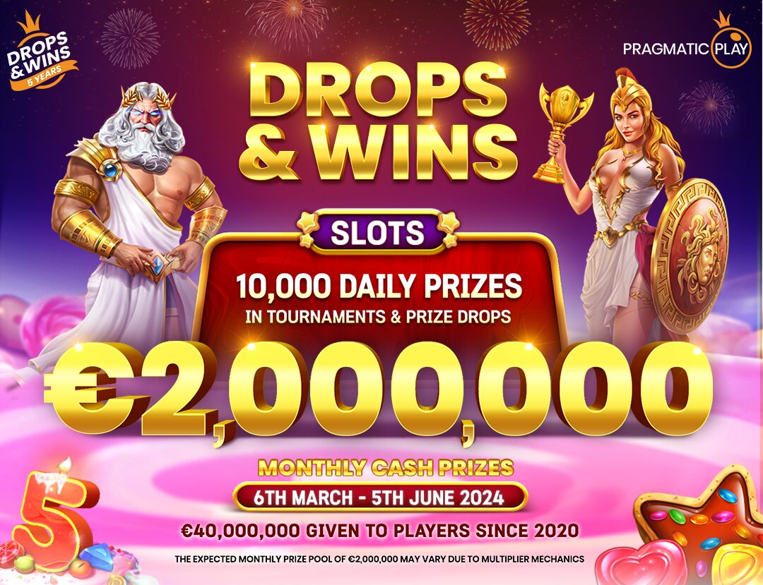 Unleash the thrill with every spin with Pragmatic Play’s Drops & Wins. Join us on this epic 91-day tournament with 10,000 daily prizes dropping and a total prize pool of EUR 2,000,000 monthly.